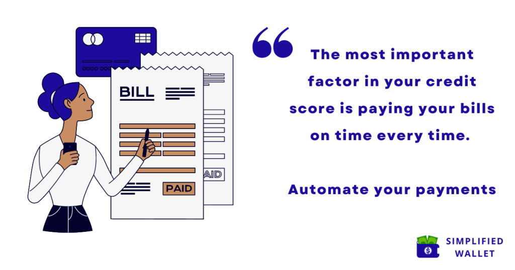 The most important factor in your credit score is your payment history. You want to make every payment on time every time. I recommend automating your payments. This ensures you will never miss a payment. You can do this for your credit cards, mortgage, student loans, phone bills, or car loans. You can pay the minimum, a fixed amount, or the entire balance automatically for credit cards. I recommend paying the full amount to avoid expensive interest fees. If you are hesitant to automate your payments, try it for 1 month and see how you feel. If you decide not to automate your payments, try setting a reminder on your calendar or an alarm on your phone. When it goes off, stop what you are doing and make your payment. It’s easy to get sidetracked and forget if you wait to do it.